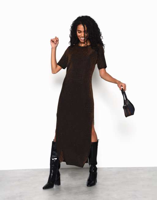 Narrated Short sleeve maxi dress with side split in black bronze