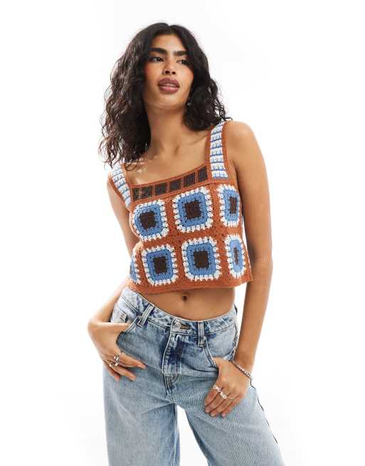 Narrated Square neck crochet vest top in brown multi