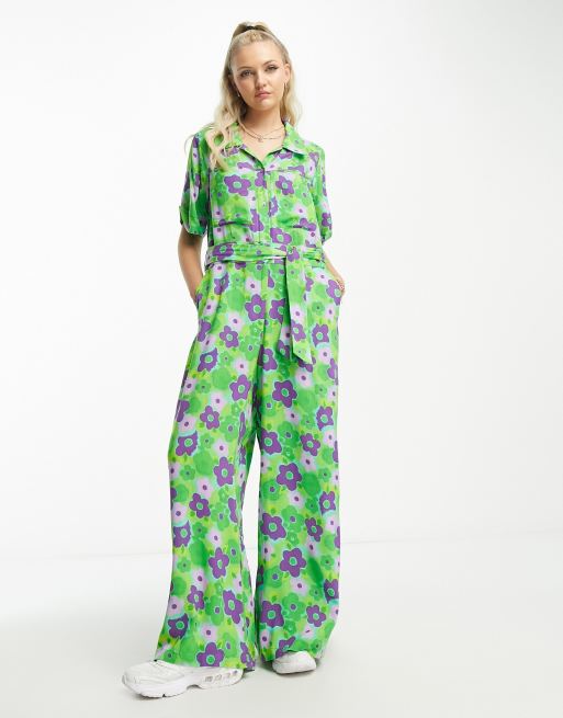 Native Youth bold floral belted boilersuit in green and purple