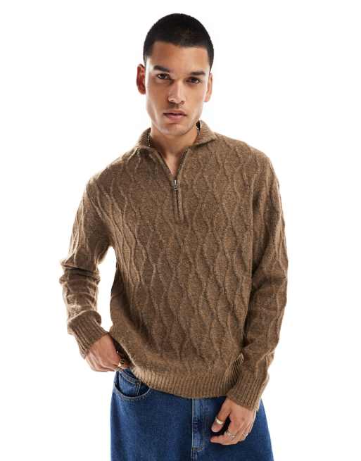 Native Youth quarter zip cable knit funnel neck jumper in brown