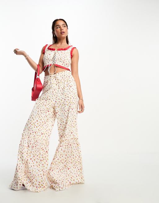 Neon Rose ditsy floral print frill edge trousers co-ord in multi