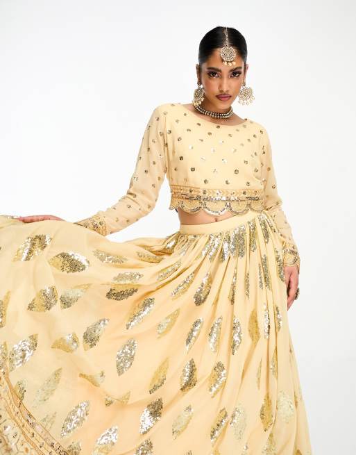 Nesavaali lehenga embroidered long sleeve crop top in gold
