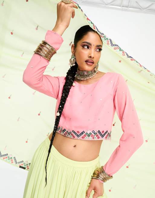 Nesavaali lehenga embroidered long sleeve crop top in pink