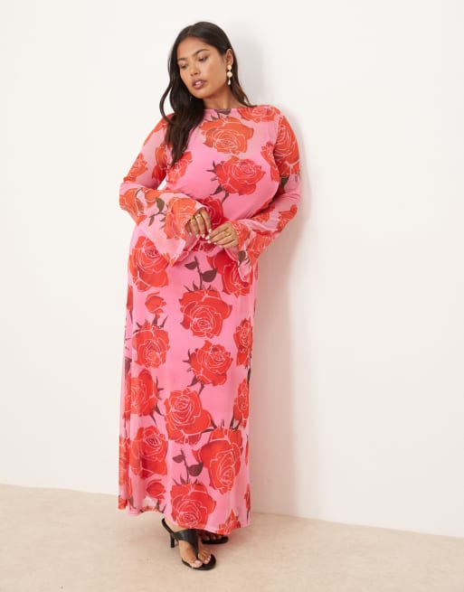 Never Fully Dressed Plus long sleeve mesh midaxi dress in pink and red rose