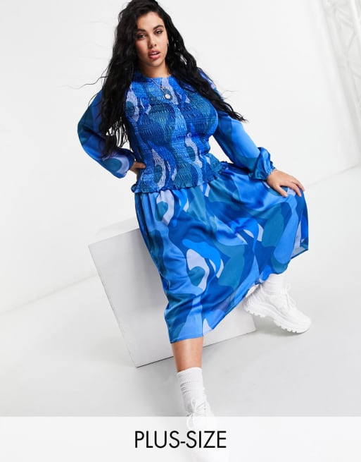 Never Fully Dressed Plus shirred top & midi skirt co-ord in blue abstract print