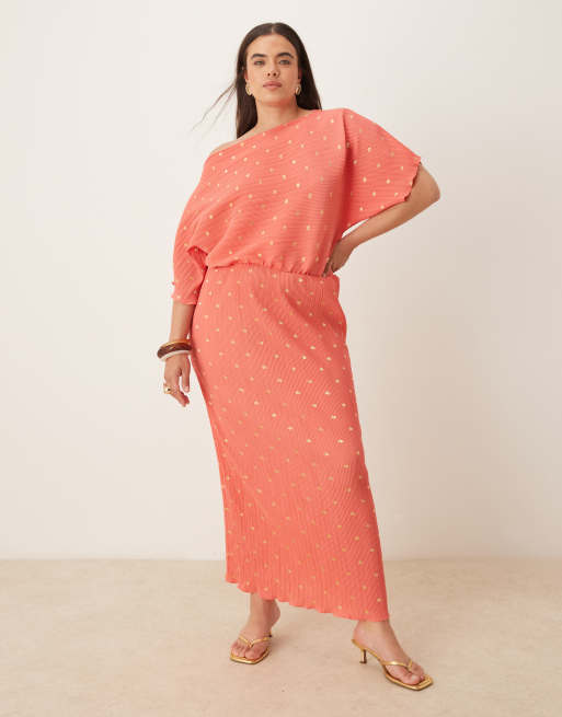 Never Fully Dressed Plus Tilly off shoulder plisse midaxi dress in coral and gold