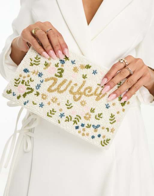 Never Fully Dressed Bridal embellished Wifey clutch bag with pearl handle in ivory