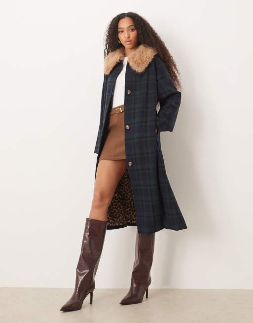 Never Fully Dressed faux fur longline coat in blue and green check