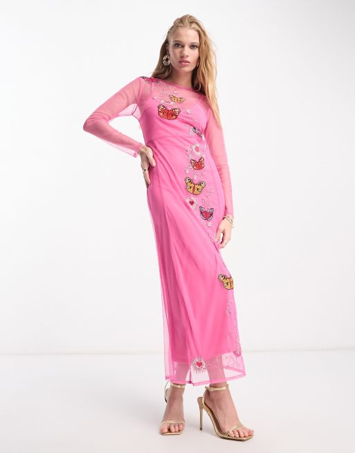 Never Fully Dressed long sleeve embellished maxi dress in pink butterfly print