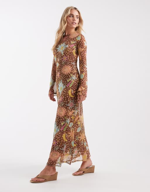 Never Fully Dressed Petite Aria mesh maxi dress in brown deer star print