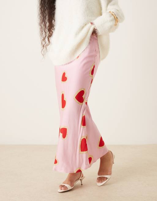 Never Fully Dressed Petite Dorris satin maxi slip skirt in pink heart print