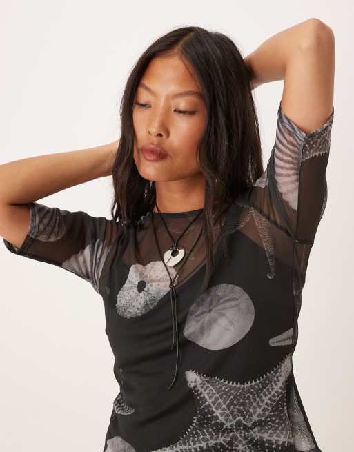 Never Fully Dressed Petite seashell print mesh t-shirt co-ord in black
