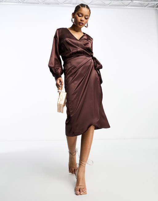 Never Fully Dressed satin wrap midaxi dress in chocolate brown