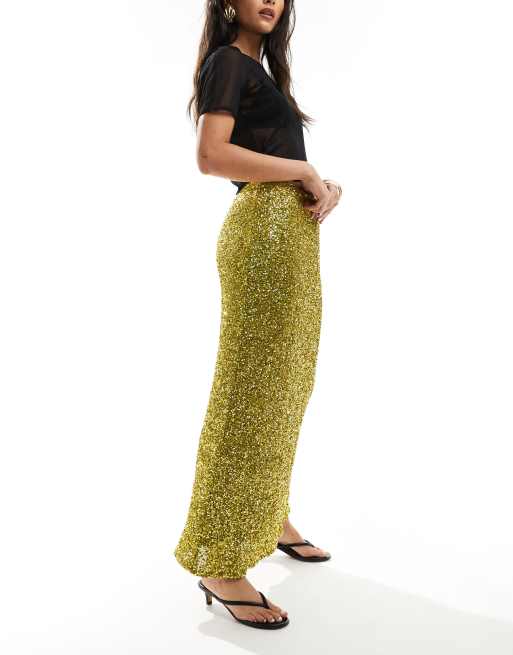 Never Fully Dressed sequin maxi skirt in olive