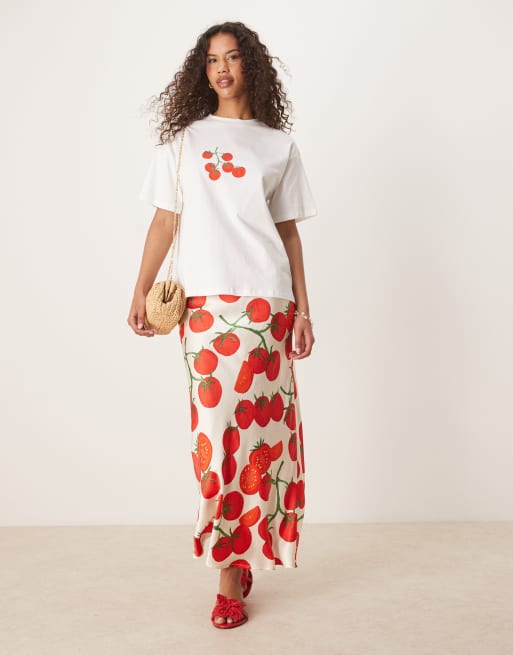 Never Fully Dressed tomato print satin maxi skirt co-ord in cream