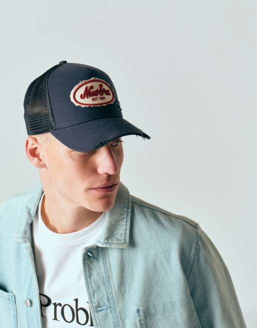 New Era oval canvas distressed patch trucker cap in navy