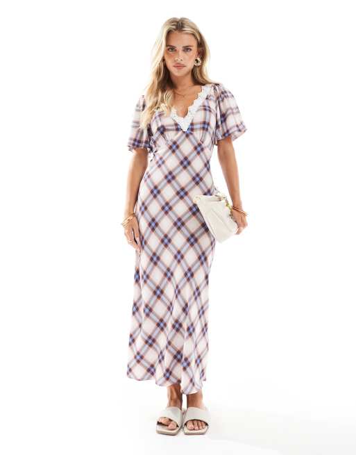 New Look Petite check lace flutter sleeve midi dress in cream