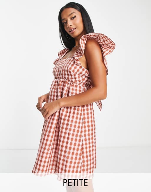 New Look Petite frill shoulder check mini dress in burgundy