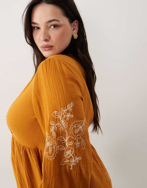 New Look Curve embroidered sleeve tea top in burnt orange