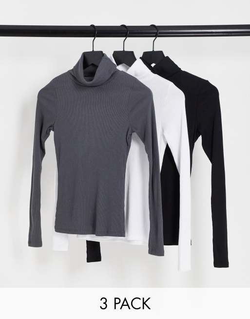 New Look 3 pack rib rolled long sleeved top in black, stone and grey
