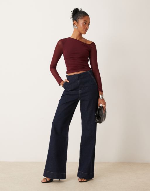 New Look asymmetric long sleeve mesh top in burgundy