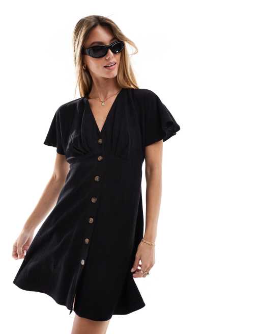 New Look button front mini dress in black linen