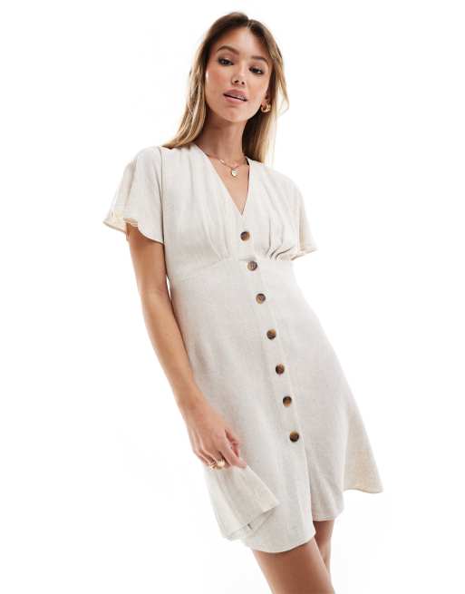 New Look button front mini dress in oatmeal linen