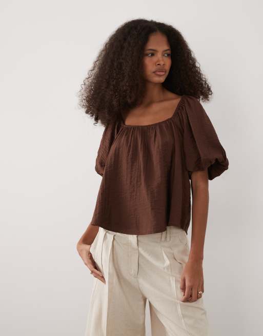 New Look crinkle square neck blouse with puff sleeve in dark brown