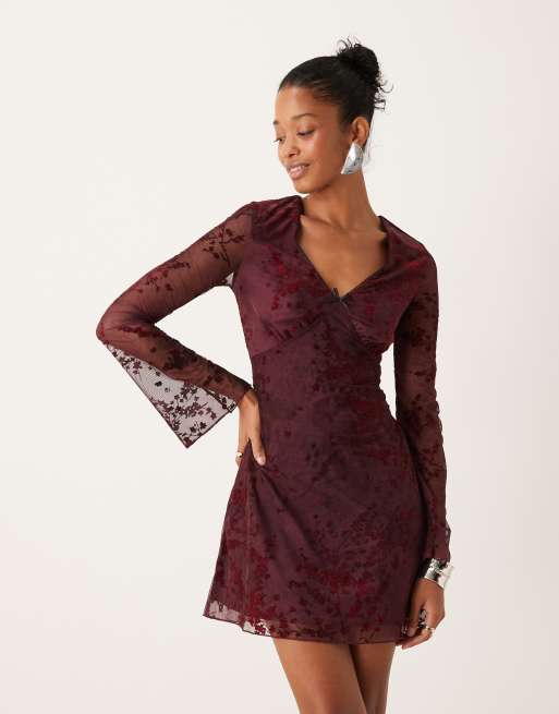 New Look flocked mesh floral mini dress in burgundy