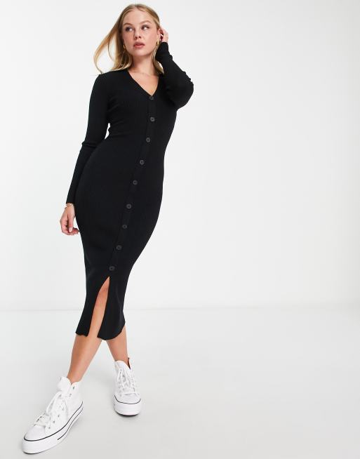 New Look knitted button front polo midi dress in black