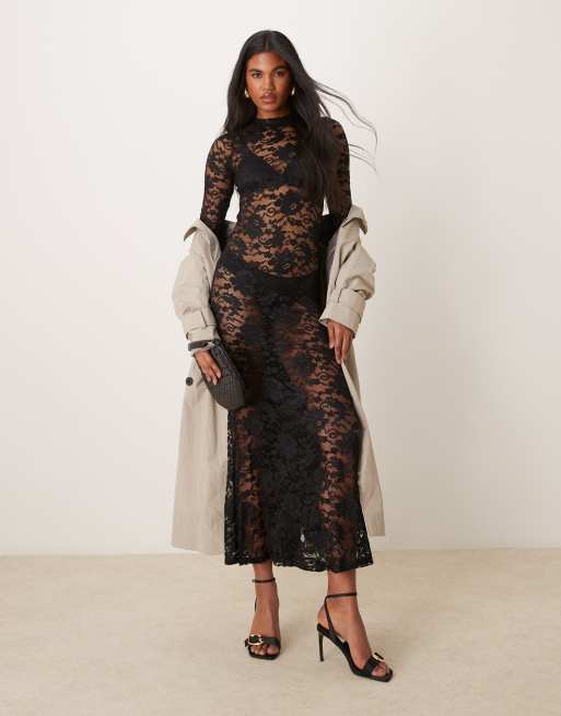 New Look lace long sleeve midi dress in black