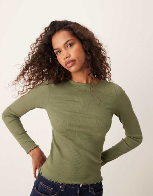New Look long sleeve lettuce edge top in khaki