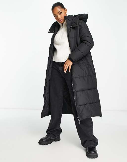 New Look longline padded coat with hood in black
