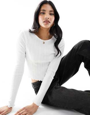 New Look pointelle lettuce hem long sleeve top in white