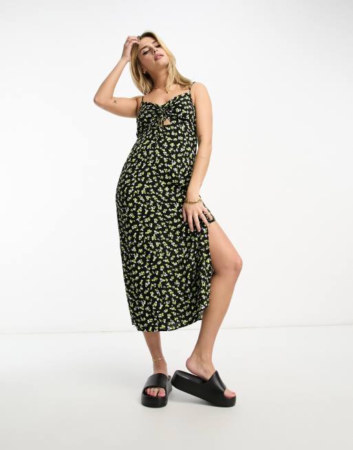 New Look ruched front strappy midi slip dress in black ditsy floral