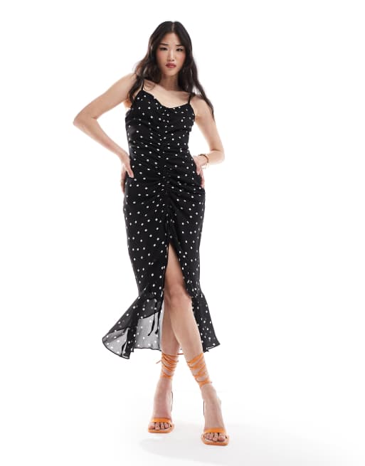 New Look ruffle maxi midi dress in black spot