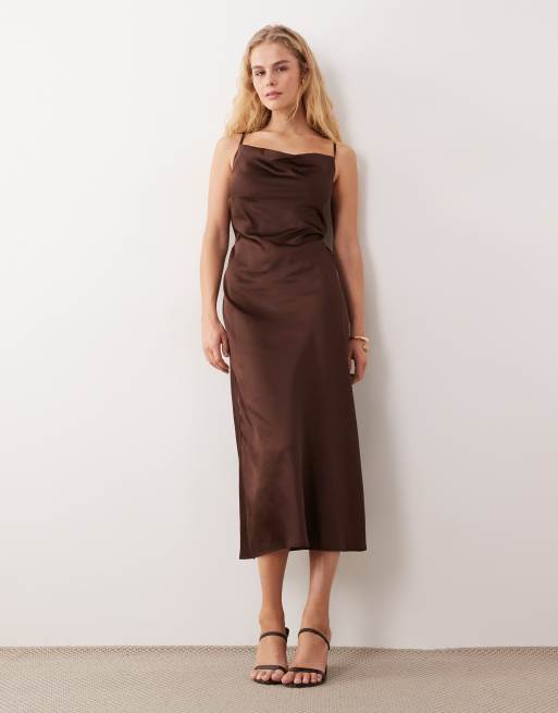 New Look satin cowl neck midi dress in brown