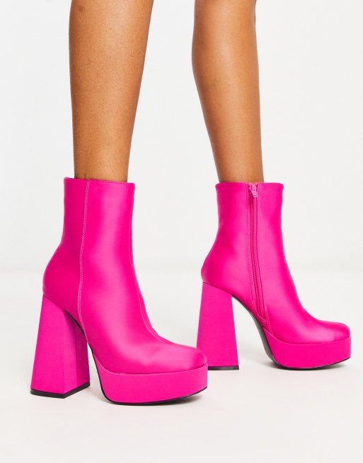 New Look satin platform heeled boots in pink