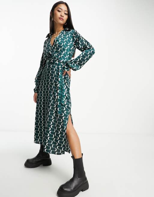 New Look satin wrap midi dress with belt in dark green pattern