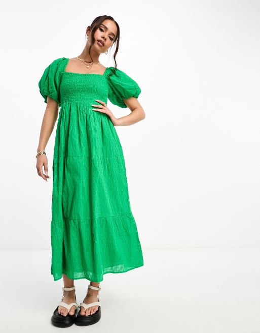 New Look shirred puff sleeve tiered dobby midi dress in bright green