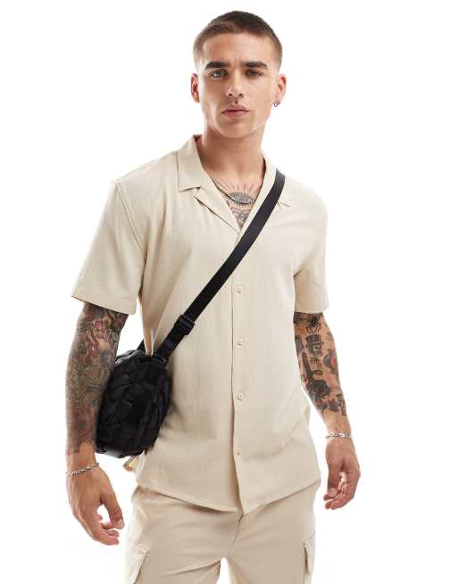 New Look short sleeved soft seersucker shirt in stone