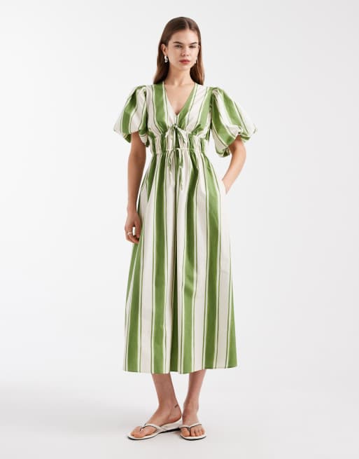 New Look stripe puff sleeve v neck midi dress in cream