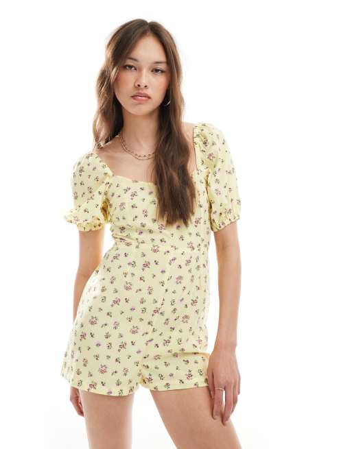 New Look tie back playsuit in yellow ditsy floral