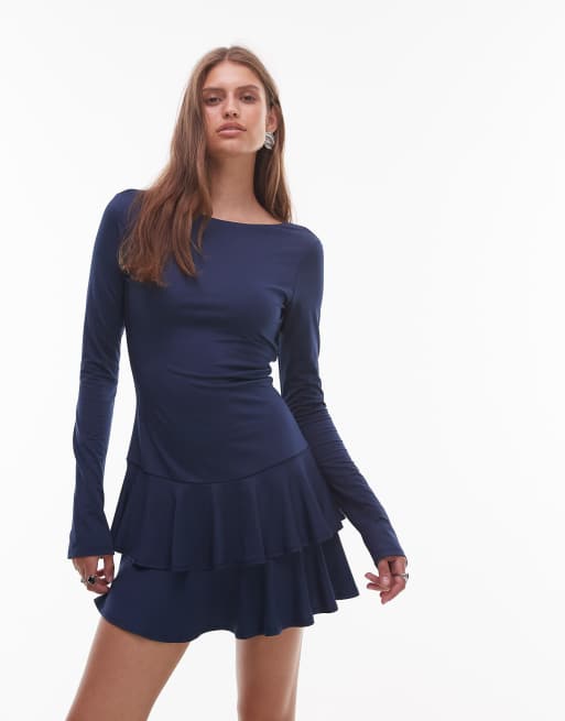 NIA Sienna boat neck long sleeve slinky mini dress in navy