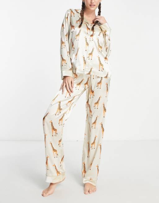 Night satin giraffe print pyjama set with velvet cuff in stone