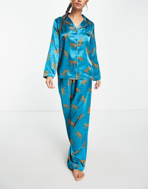 Night satin long pyjama set in teal leopard print