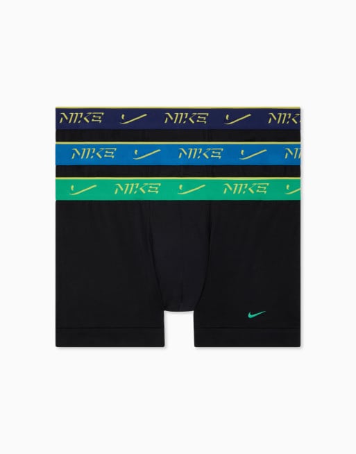 Nike Essential cotton 3 pack trunks in black with green/blue/purple waistbands