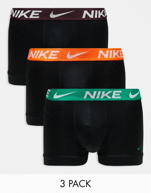 Nike Essential Microfibre 3 pack trunk with coloured waistbands in orange/burgundy/green