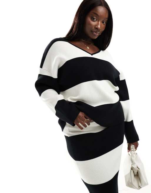 4th & Reckless Plus - Exclusives - Co-ord set van oversized trui met V-hals en maxirok met strepen in zwart en wit