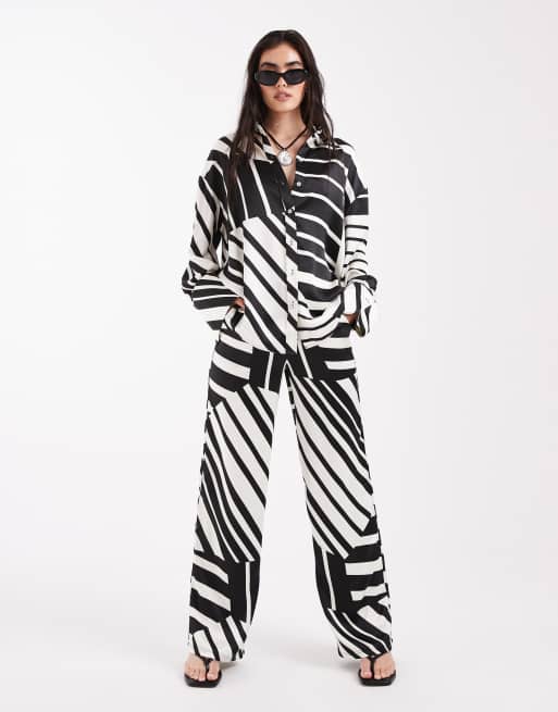 4th & Reckless - Co-ord set van satijn van overhemd met wijde manchetten en broek met wijde pijpen en print in zwart-wit